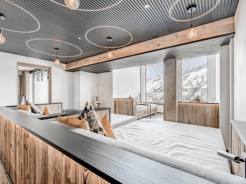Hoch über den Dächern von Hochgurgl erwartet dich jetzt ein neues Highlight: unser Jacuzzi - nur für Erwachsene. Inmitten der beeindruckenden Kulisse imposanter Gipfel tauchst du hier in wohlig warmes Wasser ein und genießt einfach nur die Wärme.